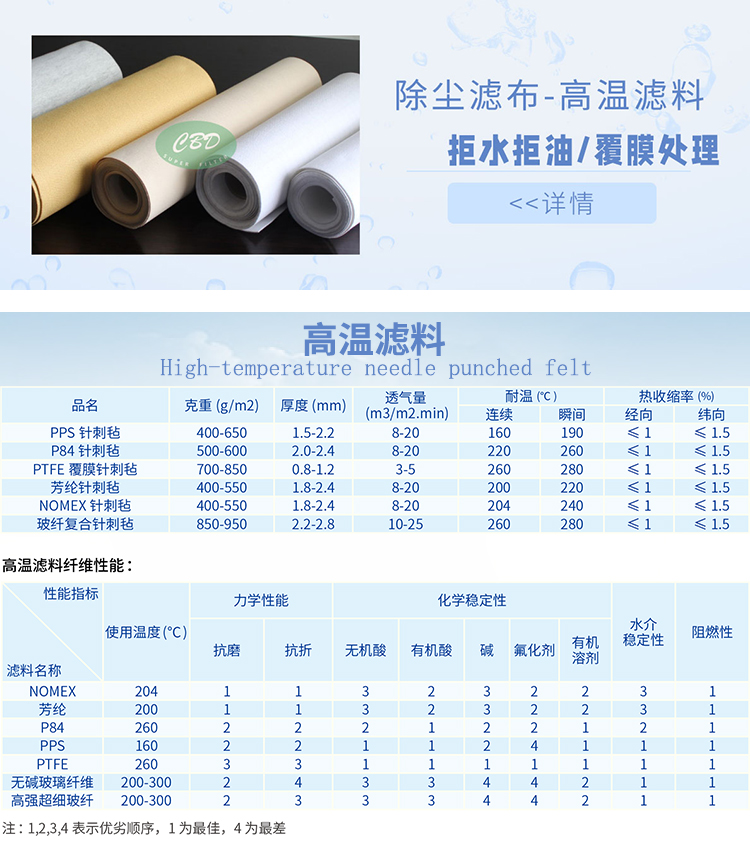 滤料有PPS针刺毡、芳纶针刺毡、玻纤复合针刺毡、PTFE针刺毡、P84针刺毡、NOMEX针刺毡等。高温针刺毡采用耐高温化纤材料针刺而成,并经定型、烧毛、轧光等后处理。使用温度可达160-280℃,是一种高效的过滤材料,耐曲挠、耐磨性好,容尘较少、清灰效果好,根据不同的种类具有耐酸碱、抗水解等优良性能。